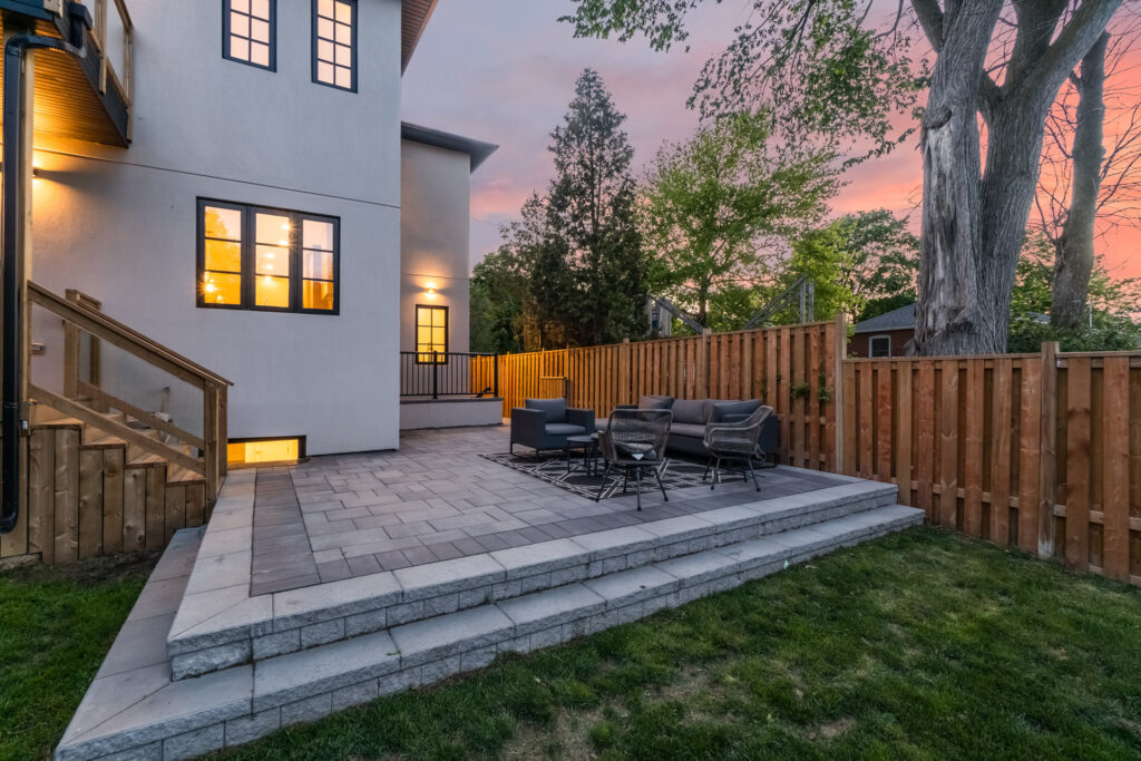 Low-maintenance patio with tight joints, proper edging, and drainage that protects the home.